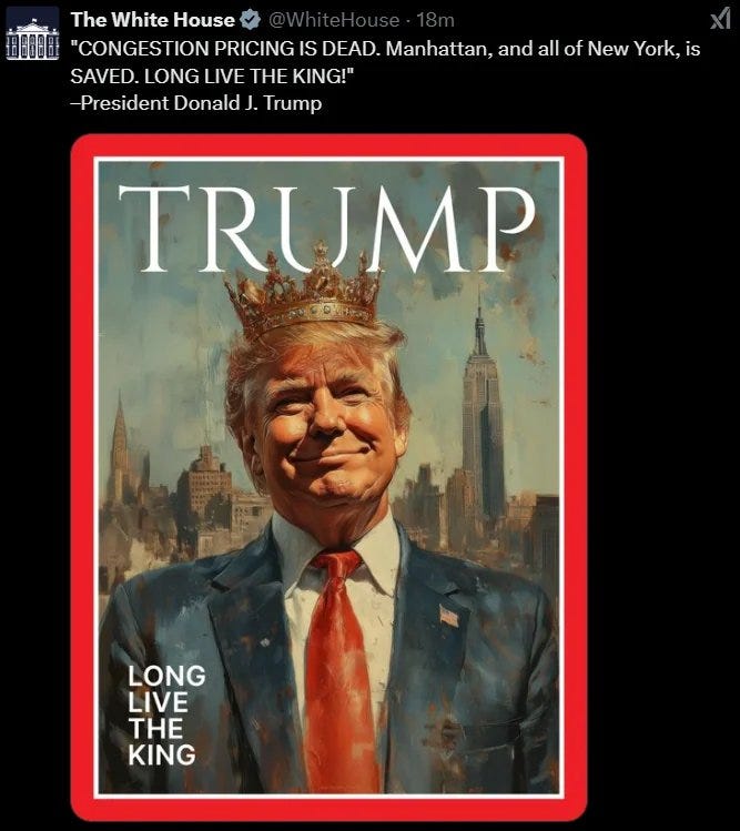I started writing this article yesterday after the White House published a new executive order, stating that the only accepted interpretations of the law in the executive branch will be those which are determined by the President of the United States or the United States Attorney General. However this afternoon, the White House posted, to all of its official social media pages, an image depicting Donald Trump wearing a crown with the text “Long Live the King”, as he seeks to override New York and New York City law to end congestion pricing in the city. That hasn’t actually appreciably changed the content of this article given that it’s fairly consistent with the point I’m going to make - that Donald Trump seeks to upend the rule of law and basic fundamental concepts of Democracy in the United States.